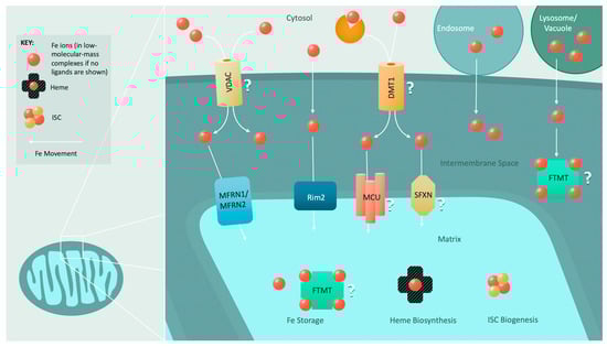 Mitochondrial iron import and utilization: The mechanism for iron import through the outer mitochondrial membrane is poorly understood. However, it is speculated that ion channels such as VDACs and a recently identified mitochondrial divalent metal transporter (DMT1) facilitate the import of iron. Interorganellar contacts with endosomes, lysosomes, and vacuoles can also convey iron to mitochondria. Transport across the inner mitochondrial membrane is primarily driven by the conserved mitoferrins (MFRN1 and MFRN2). In yeast, a low-affinity iron transporter (Rim2) assists the mitoferrins. Roles in inner mitochondrial membrane iron import have also been hypothesized for the mitochondrial calcium uniporter (MCU) and several members of the sideroflexin (SFXN) family. Once iron is imported into the mitochondrion, it is utilized for heme biosynthesis or ISC biogenesis, or it is stored in mitochondrial ferritin (FTMT) or within low-molecular-mass complexes.