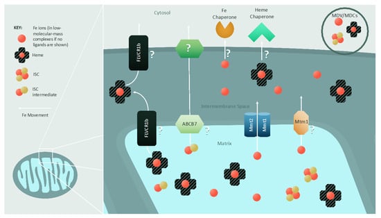 Non-protein pathways—specifically, mitochondria-derived compartments (MDCs) and mitochondria-derived vesicles (MDVs)—are also hypothesized to participate in the efflux of “free” iron, along with ISCs and heme. MDCs and MDVs are single- and double-membrane-bound vesicles with an approximate diameter of 70–100 nm that can interact with other subcellular compartments, such as the ER, lysosome, and peroxisome [,,,,,]. MDVs have been shown to contain various cargo loads, including metabolites and proteins [,], and proteomic analysis of purified MDVs has uncovered high levels of mitochondrial ISC biogenesis proteins and proteins capable of binding iron []. The strategy of mobilizing “free” iron, ISCs, and heme through MDCs and MDVs would be advantageous in terms of minimizing their cytotoxic effects and enhancing their availability.