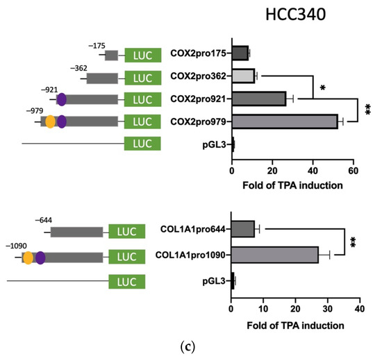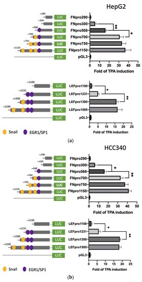 Deletion mapping for identifying TPA-responsive element on FN, LEF, COX2, and COL1A1 promoter. HepG2 (a) and HCC340 (b,c) cells were transfected with PGL3, the full-length promoter of FN (FNpro1150) (a and b, upper panel), LEF (LEFpro1595) ((a,b), lower panel), COX2 (COX2pro921) and COL1A1 (COL1A1pro1090) ((c), upper and lower panel, respectively) or the promoter constructs deleted from 5′ end of each of the full-length promoters as indicated, followed by TPA treatment for 12 h (a–c). Dual-luciferase was performed. Relative fold of TPA-induced luciferase activity was calculated, taking the data of pGL3 group as 1.0. In each figure, (*, **) represent the statistically significant difference (p < 0.05, p < 0.001, N = 5) between the indicated promoter fragments.