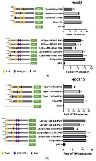 To prove whether the candidate SNA binding motifs are required for transcription of the aforementioned mesenchymal genes, site-directed mutagenesis coupled with promoter analysis were performed. For FN, promoter mutants with the altered sequence (TCACA→TTGTA) at indicated SNA motifs (PM 1–3) were produced for analysis in both HepG2 (Figure 4a, upper left panel) and HCC340 (Figure 4b, upper left panel). Remarkably, FN promoter mutant with the altered sequence at the proximal (3′) SNA binding motif (PM3) exhibited a 60% decrease of TPA-induced promoter activation compared with that of the wild type FNpro1150 in both HepG2 (Figure 4a, upper right panel) and HCC340 (Figure 4b, upper right panel) at 12 h, whereas mutation of FN promoter at the middle SNA (PM2) and the distal (5′) SNA region (PM1) did not decrease the TPA-induced promoter activation. Similarly, LEF promoter mutant with the altered sequence at the proximal (3′) SNA (PM2) but not the distal (5′) SNA (PM1) (Figure 4a,b, lower left panel) exhibited a significant decrease (by 50–70%) of TPA-induced promoter activation than that of the wild type LEFpro1595 in both HepG2 (Figure 4a, lower right panel) and HCC340 (Figure 4b, lower right panel). Collectively, these results validated that the most proximal (3′) SNA binding regions on promoters of both FN and LEF are essential for TPA-induced promoter activation, consistent with the data obtained in deletion mapping analysis (Figure 3). In addition, mutation (CCCCGCCT→CCCTATCT) on the E/S region (−1195 to −1179 bp) of LEFpro1595 (LEFpro1595 E/S-PM1) close to the active SNA motif, but not the next (proximal) E/S region (−1148 to −1131 bp) (LEFpro1595 E/S-PM2) (Figure 4a,b, lower left panel) also attenuated the TPA-enhanced promoter activation of LEFpro1595 by 33% in HepG2 (Figure 4a, lower right panel) and HCC340 (Figure 4b, lower right panel). As a negative control, mutagenesis on the FOXA2 region close to the active SNA region has no effect on TPA-induced promoter activation of LEF (Figure 4b, lower panel). On the other hand, mutagenesis of SNA binding motif on COX2 and COL1A1 promoter decreased the TPA-induced promoter activation of the full length COX2pro979 and COL1A1pro1090 by 66 and 72%, respectively, whereas mutagenesis of EGR1/SP1 overlapping region attenuated the aforementioned full-length promoters by 30% (Figure 4c). Taken together, the proximal (3′) SNA region coupled with the adjacent E/S overlapping region are responsible for TPA-induced promoter activation of FN, LEF, COX2, and COL1A1.