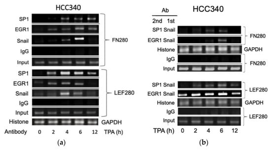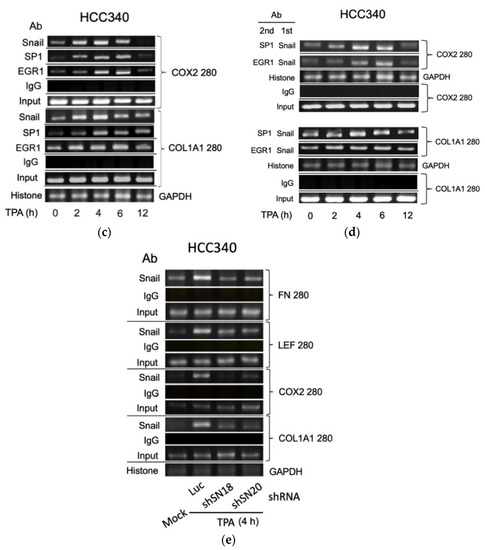 The following are available online at https://www.mdpi.com/article/10.3390/cells10092202/s1, Figure S1: Map for ChIP fragment and EMSA probe for FN, LEF, COX2 and COL1A1 promoter, Figure S2: Time course of TPA-induced gene expression of SNA, FN, LEF, COX2, and COL1A1 in HCC340, Figure S3: SNA is essential for constitutive and TPA-induced gene expression of FN, LEF, COX2, and COL1A1, Figure S4: SNA overexpression increased motility of HCC, Figure S5: SNA is required for TPA-induced promoter activation of FN and LEF in HepG2, Figure S6: Promoter sequences of FN, LEF, COX2, and COL1A1 containing Snail and EGR/SP1 overlapping region, Figure S7: Quantitative PCR for ChIP and double ChIP assay for TPA induced binding of transcription factors on promoters of FN and LEF in HCC340.