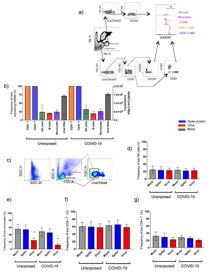 The viral replication (dsRNA) was found in all cellular phenotypes explored, as monocytes, lymphocytes T and B, and natural killer cells. Our data show that viral SARS-CoV-2 infectivity in PBMC was similar for COVID-19 and unexposed subjects (Figure 1a,b).