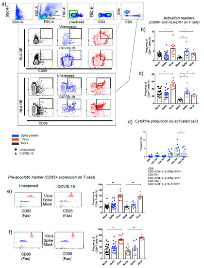 The apoptotic marker, CD95, was elevated independently of previous disease in CD4+ T and CD8+ T cells after SARS-CoV-2 infection (Figure 3e,f). However, apoptotic CD8+ T cells (CD95+) were significantly higher in COVID-19 than unexposed individuals (Figure 3e,f and Figure 4e,f). Meanwhile, spike protein showed no changes for apoptotic T cells (Figure 3e,f and Figure 4e,f).
