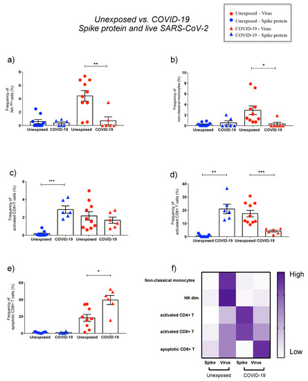 Major effects of spike protein and live SARS-CoV-2 on PBMC phenotypes comparing unexposed and COVID-19 groups. Percentage of natural killer cytotoxic subset (NKdim, CD3−CD56lowCD16high) (a) and nonclassical monocytes (CD3−CD14−CD16+) (b) in unexposed (circles) and COVID-19 (triangles) after spike protein (blue) and in vitro virus exposure (red). Percentage of activated (CD69+HLA−DR+) CD4+ (c) and CD8+T lymphocytes (d), as well as apoptotic (CD95+) CD8+ T lymphocytes (e) after antigen stimulation (spike protein and virus). Heat map of phenotypes percentages affected by spike protein and live virus stimulation on unexposed and COVID-19 (f). The final value percentage represented by y axis is the percentage of cells activated by SARS-CoV-2 antigens subtracted from unstimulated cells (% of cells stimulated with spike protein or virus minus % of the cells from mock condition). Symbols legend represents each sample collected from each volunteer. The data are representative of 2–5 different experiments. * p < 0.05, ** p < 0.01, and *** p < 0.001.