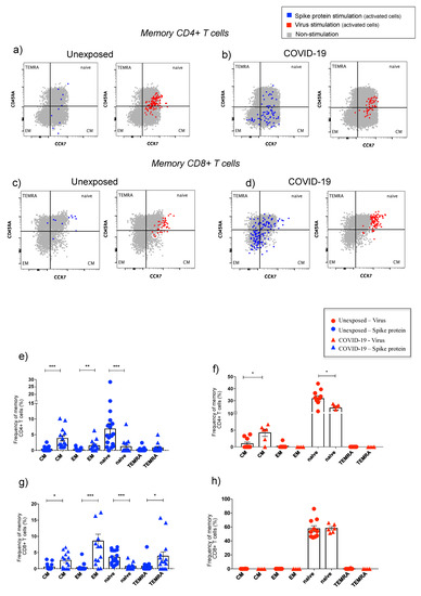 After spike stimulation, a significant elevation for central and effector memory CD4+ T-cells frequencies was detected for COVID-19, followed by all memory subsets for CD8+ T cells, except for naive subset, compared to the unexposed group (Figure 5a–e,g). After SARS-CoV-2 infection, the only alteration on the memory T cells was on the frequency of central memory CD4+ T cells, also higher in the COVID-19 as compared to the unexposed group (Figure 5f,h).
