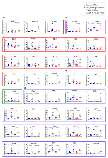 Normalized gene expression of peripheral blood mononuclear subset cells from individuals exposed to SARS-CoV-2 or otherwise after stimuli with spike SARS-CoV-2 protein. Detailed scatted dot plots show normalized expression for genes analyzed in COVID-19 (triangular shapes) or unexposed individuals (circular shape), according to experimental stimuli with spike protein (blue dots) or SARS-CoV-2 (red dots). The number of dots varies according to gene analyzed due to failed amplifications. Boxes represent the median and vertical bars as well as the standard error of normalized expression for each experimental group analyzed using references genes RPL13 and 18S. Genes were clustered in boxes according to biological/immunological functions: SARS-CoV-2 receptors (black) (a), apoptosis (purple) (b), inflammation (red) (c), regulation of inflammation (green) (d), and innate antiviral response (blue) (e). Graphics and statistical comparisons of normalized expression for unexposed and COVID-19 using Mann–Whitney test in software GraphPad Prism 8.4.2. * p < 0.05, ** p < 0.01, and *** p < 0.001.