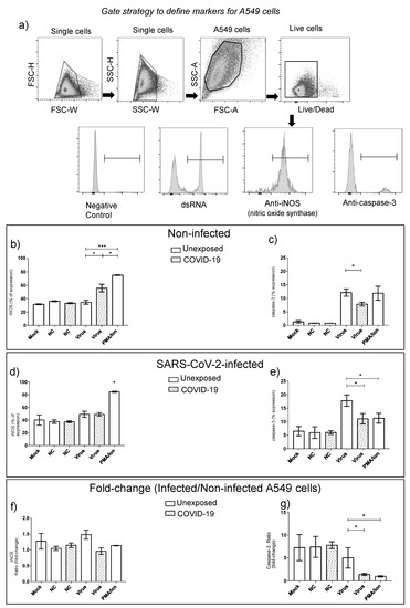 The contact with the live virus by PBMC from primo-infected subjects displayed a significant elevation of A549 expressing iNOS, as well as a reduction of caspase-3 by those cells before SARS-CoV-2 infection compared to the unexposed group (Figure 7b,c). After viral infection of alveolar epithelial cells, the product of cellular immune responses from COVID-19 remained inducing the reduction of caspase-3 expression by A549 cells (Figure 7e,g).