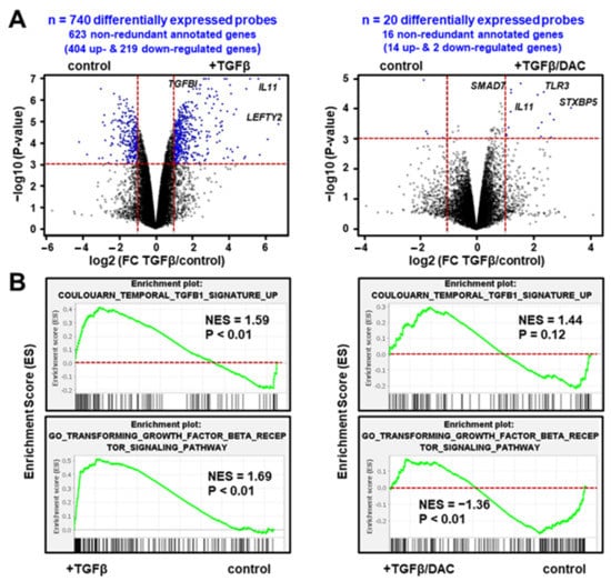 Decitabine impairs the transcriptional response of SNU449 HCC cells to TGFβ. (A) Volcano plot highlighting differentially expressed probes (blue dots) in SNU449 cells treated with TGFβ (16 h) in the absence (left panel) or presence (right panel) of decitabine (DAC). Probes were selected based on the significance of the differential expression in the experimental conditions (horizontal red line; p < 0.001) and the level of induction or repression (vertical red lines; fold change >2). In total, 740 probes were differentially expressed upon TGFβ treatment in the absence of DAC, but only 20 probes in the presence of DAC, using the same selection criteria. (B) Gene set enrichment analysis (GSEA) using the gene expression profiles of SNU449 cells treated with TGFβ in the absence (left panels) or presence (right panels) of decitabine. Shown are the enrichment plots of two curated TGFβ-associated gene expression signatures. NES: Normalized Enrichment Score.