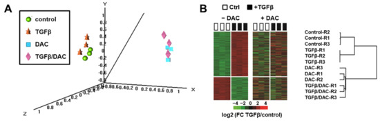 Importantly, in the presence of decitabine, only 20 probes, corresponding to 16 well-annotated non-redundant genes, were differentially expressed by TGFβ using the same statistical criteria (i.e., with a TGFβ/control FC > 2 and a p-value < 0.001). Among these genes, SMAD7 and IL11 remain upregulated by TGFβ (Figure 1A, right panel). As shown in Figure 1B (right panels), the curated TGFβ signatures were not enriched anymore in the gene expression profiles of SNU449 cells exposed to TGFβ and decitabine. In fact, a statistically significant negative enrichment (NES = −1.36; p < 0.01) was observed with the TGFβ signature established by the Gene Ontology Consortium. In addition, principal component analysis using the whole gene expression profiles (Figure 2A) and clustering analysis based on the expression of 740 probes differentially expressed upon TGFβ exposure (Figure 2B), demonstrated that the transcriptomic profile of SNU449 cells exposed to TGFβ in the presence of decitabine (TGFβ/DAC) was closer to the transcriptomic profile of cells exposed to decitabine (DAC) than to TGFβ or controls. Altogether, these data demonstrate that decitabine greatly impairs the transcriptional response of SNU449 HCC cells to TGFβ.