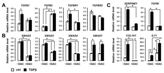 Decitabine greatly impacts the expression of regulators and effectors of the canonical SMAD/TGFβ signaling pathway. Analysis of the expression of genes encoding (A) TGFβ ligands and receptors, (B) SMADs transducers and regulators of TGFβ signaling, and (C) well-known TGFβ targets, in SNU449 cells treated with TGFβ (black bars) versus control (white bars) in the absence (left 2 bars) or presence (right 2 bars) of decitabine (DAC). SNU449 HCC cells were treated alone or in combination with 1 ng/mL TGFβ1 and 100µM decitabine (DAC) for 24 hrs. * p < 0.05 (± TGFβ, ± DAC).