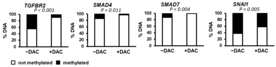 Methylation status of the promoters of genes associated with the TGFβ pathway. DNA methylation of TGFBR2, SMAD4, SMAD7 and SNAI1 promoters was evaluated in SNU449 HCC cells in the absence (left bar, −DAC) or presence of decitabine (right bar, +DAC). p value was determined by using a chi-square test (Yates value corrected for continuity).