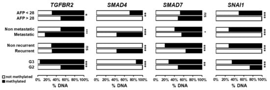 Methylation status of the promoter of TGFBR2, SMAD4, SMAD7 and SNAI1 genes in human HCC tumors and correlation with clinical and biological parameters. The percentage of DNA methylation was correlated with tumor grade (G2 vs. G3), recurrence, metastasis and serum alfa-fetoprotein levels. *** p < 0.001; ** p < 0.01; * p < 0.05; ns p > 0.05.