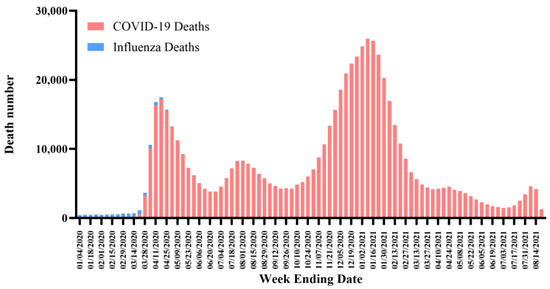 Weekly death analysis of COVID-19 and influenza in the USA. Data may lag by an average of 1–2 weeks, so the trend of decline in recent weeks may not accurately reflect the current situation. Available online: https://data.cdc.gov/NCHS/Provisional-COVID-19-Death-Counts-by-Week-Ending-D/r8kw-7aab (accessed on 24 August 2021).