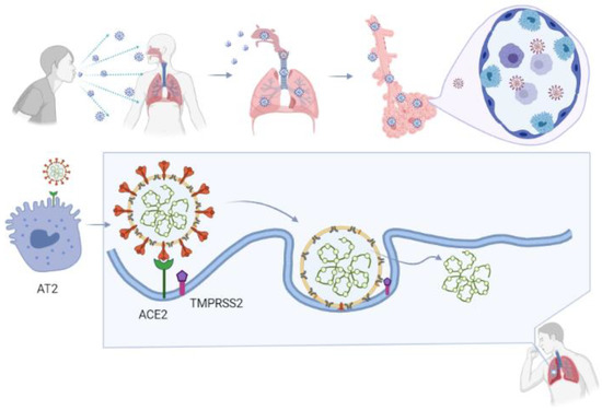 SARS-CoV-2 infection route. Infected COVID-19 patients can spread the virus by sneezing or coughing, or by any other route that drops the infectious particles onto another surface. When a person contracts the virus, the virus recognizes its binding target, ACE2, which is expressed on type II alveolar cells (AT2) in the lower respiratory tract. In the fusion step, the S protein on SARS-CoV-2 binds to ACE2, followed by cleavage of the S glycoprotein-ACE2 complex at polybasic motif (PPAR) at S1/S2 by type 2 transmembrane serine protease (TMPRSS2) and other proteases, leading to conformational alteration and activation of the S-glycoprotein. After fusion with the host cell membrane, the virus releases its genomic material into the cytoplasm.