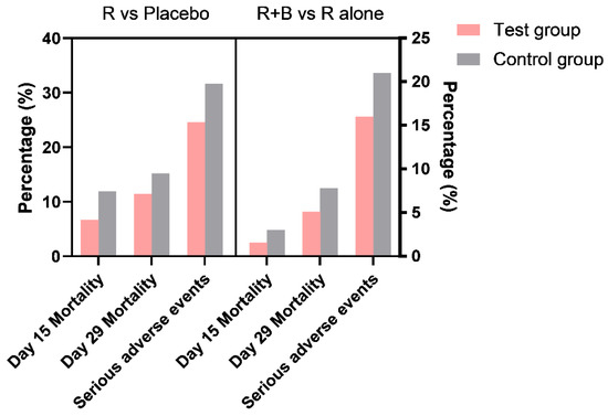 Remdesivir versus remdesivir plus baricitinib clinical trials. Comparison of mortality rate and serious adverse events of two clinical trials regarding remdesivir (R) compared with a placebo, and remdesivir in combination with baricitinib (R+B) compared with remdesivir alone (R alone). Data source: Remdesivir for the Treatment of COVID-19—Final Report [139], Baricitinib plus Remdesivir for Hospitalized Adults with COVID-19 [143].