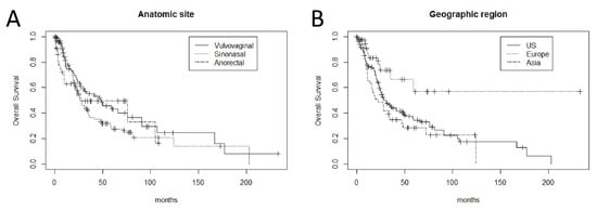 (A) Kaplan–Meier curves demonstrate no significant correlation between overall survival and anatomic sites (log-rank p = 0.3); (B) Kaplan–Meier curves demonstrate a significant correlation between overall survival and geographic areas (log-rank p = 0.01).
