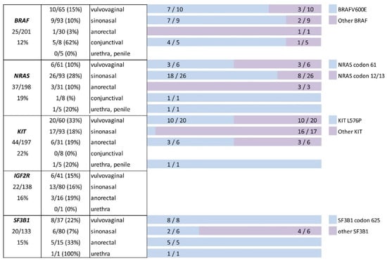In line with prognosis, genetic alterations occurring in mucosal melanoma are different than those of cutaneous wild-type melanoma (BRAF, NRAS and NF1 negative) [2,3]. The frequency of frequently mutated genes are as follows: NRAS (14–30%), BRAF (5–16%), NF1 (16%), KIT (5–15%), SF3B1 (12%), TP53 (8.9%), SPRED1 (7%), ATRX (6%) and CHD8 (4%) [4,5,6,7,8,9,10]. Recently, IGF2R mutation was documented in 32% of 41 mucosal melanomas in comparison to 6% of 48 cutaneous melanomas [10].