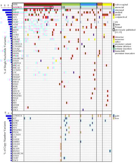 The NGS results of 49 mucosal melanomas (6 vulvar, 17 anorectal, 13 sinonasal, 8 conjunctival, 1 urethral and 4 penile), together with the published results of 26 vulvovaginal melanomas, are summarized in Figure 3 [11,13]. BRAF, KIT and NRAS were the most common recurrent mutations, seen more frequently in vulvovaginal and sinonasal melanomas in comparison to anorectal melanomas. In addition, mutations affecting the APC, ATM, ATRX, CDH1, KRAS, NF1, NF2, PIK3R1, TSC2, TP53 and TERT promoter regions were noted. Of the triple (BRAF, NRAS, NF1)-negative cases, APC, KIT and KRAS were detected mainly in sinonasal, vulvovaginal and anorectal melanomas, respectively. Copy number variants, including loss of CDKN2A and gain of KIT, CDK4 and MYC, were frequently seen in mucosal melanomas.