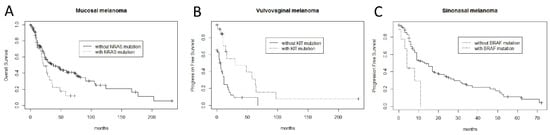 Kaplan–Meier curves demonstrate significant correlation between: (A) worse overall survival and NRAS mutation in mucosal melanomas (log-rank p = 0.028); (B) better progression-free survival and KIT mutation in vulvovaginal melanomas (log-rank p = 0.0021); (C) worse progression-free survival and BRAF mutation in sinonasal melanomas (log-rank p = 0.0045).