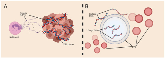 Surface DNA. Little is known about DNA interaction with circulating tumor cells (CTCs) or extracellular vesicles (EVs). (A) Neutrophils travel with CTC clusters in the bloodstream; this interaction might be facilitated by netosis with the formation of neutrophil extracellular traps (NETs) of DNA expelled from the neutrophil nucleus. (B) DNA may be present on the EV surface; however, few studies have been performed to understand this phenomenon.