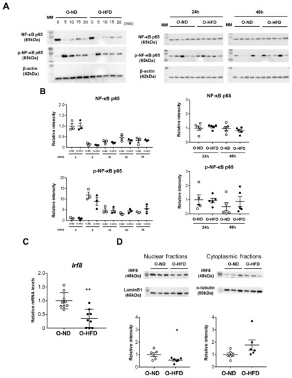 NF-κB signaling has been reported to be significantly involved in RANKL-induced osteoclast differentiation via the activation of NFATc1. Therefore, we examined NF-κB-p65 activation upon TNF-α stimulation. The phosphorylation of p65 was significantly increased 5 min after TNF-α stimulation and declined gradually. However, no difference could be observed between the two groups (Figure 7A,B). The phosphorylation of p65, as well as p65 protein expression 24 h and 48 h after TNF-α stimulation, was also comparable (Figure 7A,B), suggesting that NF-κB signaling is not likely to be responsible for the enhanced activation of NFATc1 in BMDMs of O-HFD. It is evident that osteoclastogenesis is restrained by transcriptional repressors, such as IRF8, which are basally expressed in osteoclast precursors [23,24,25]. Hence, we examined the mRNA expression levels of transcriptional repressors in the early stage of osteoclast differentiation. The mRNA expression levels of IRF8 were significantly lower in O-HFD than in O-ND before TNF-α stimulation (Figure 7C). While the cytoplasmic fraction of IRF-8 was comparable between the two groups, the nuclear fraction was significantly lower in O-HFD compared with that in O-ND (Figure 7D). Considering the autoamplification of NFATc1 [26], these findings suggest that a lower expression of IRF8 in osteoclast precursors is implicated in the augmented NFATc1 activation after the TNF-α stimulation independent from NF-κB signaling, leading to enhanced differentiation into osteoclast-like macrophages.