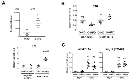 Epigenetic mechanisms underlying the osteoclast differentiation have been previously reported. Fang et al., revealed IRF8 repression by chromatin-based mechanisms in an early stage of osteoclast differentiation [27]. They demonstrated that EZH2 was engaged to the IRF8-promoter region upon RANKL stimulation to deposit the negative histone mark H3K27me3, thereby downregulating the IRF8 expression. Further, the inhibition of EZH2 by the small molecule GSK126 increased the IRF8 expression, accompanied by the downregulation of NFATc1. Therefore, we performed a ChIP assay and found that the histone modification of H3K27me3 at the IRF8 promoter region was significantly higher in the BMDMs of O-HFD before TNF-α stimulation (Figure 8A). To examine the effect of H3K27me3 on IRF8 mRNA expression, BMDMs were treated with EZH2 inhibitor GSK126 before TNF-α stimulation. The treatment with GSK126 significantly augmented the IRF8 mRNA expression in BMDMs of O-HFD, while no discernable difference was observed in the IRF8 mRNA expression in BMDMs of O-ND (Figure 8B). Finally, we examined the effect of GSK126 on the mRNA expression of NFATc1 and TRAP upon TNF-α stimulation. Two days after TNF-α stimulation, the mRNA expressions of NFATc1 and TRAP were significantly increased; however, there was no difference between the two groups (Figure 8C), suggesting that a restored IRF8 expression by GSK126 treatment could reverse the enhanced differentiation of BMDMs into osteoclast-like macrophages in O-HFD.