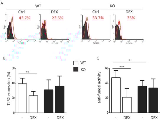 Since GILZ is one of the most important early-induced genes by glucocorticoids, we aimed to define the role of glucocorticoids in the regulation of TLR2 in neutrophils in wild type (WT) and GILZ knock-out (KO) mice. We administered the synthetic glucocorticoid DEX to WT and KO mice and evaluated the level of TLR2 expression on isolated peripheral neutrophils by flow cytometry after 3 h. Figure 1A,B shows that treatment with DEX downregulated TLR2 in WT but not in the KO mice, suggesting that GILZ was involved in glucocorticoid-mediated downregulation of TLR2. Since TLR2 is upregulated following exposure to several microorganisms and also regulates neutrophil functionality, a reduction in its expression can account for the anti-inflammatory effect of glucocorticoids on neutrophils as well as a reduction in the sentinel function of these cells. Therefore, we explored the anti-fungal activity of peripheral neutrophils in the same experimental settings. We found that DEX reduced the candidacidal activity of neutrophils in WT neutrophils, but not in KO cells from DEX-treated mice (Figure 1C), suggesting that GILZ was involved in this function, which is linked to TLR2 expression. Interestingly, peripheral resting neutrophils from the KO mice exhibited a spontaneous reduction in anti-Candida activity when compared to WT mice.