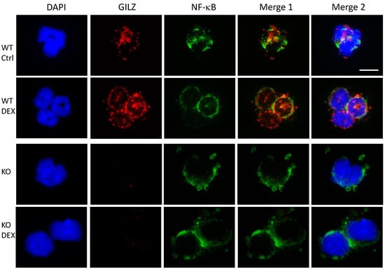 To investigate the mechanism by which GILZ controls TLR2 expression, we first analysed the transcription factor NF-κB, which is a known GILZ-interacting protein, whose binding sites have been identified in the promoter of mouse TLR2 [11,42,43,44,45,46]. Thus, we sought to find a potential interaction between GILZ and NF-κB in neutrophils under our experimental conditions that could account for the observed reduction of TLR2 expression. To this end, we treated WT and KO mice with an intraperitoneal injection of DEX and isolated neutrophils from the peripheral blood after 3 h. We performed an immunofluorescence assay for NF-κB localization. Figure 2 shows that NF-κB was localized in the cytoplasm as expected (green fluorescence), in both WT and KO cells, but not in all cells, and never found in the nucleus, indicating no activation of this factor in any of ourexperimental conditions. GILZ was expressed in the cytoplasm, and increased expression was observed following DEX treatment, as expected [18]. Surprisingly, GILZ staining (red fluorescence) did not overlap with NF-κB staining (green fluorescence) in both the untreated and DEX-treated mice.