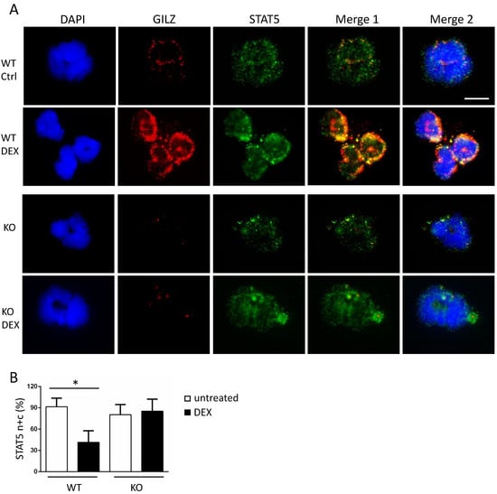 GILZ and STAT5 staining overlaps in mouse neutrophils. (A) Isolated peripheral WT and KO neutrophils were spotted on slides after 3 h of in vivo DEX treatment. The nuclei were stained with DAPI. Cytoplasmic and nuclear STAT5 (green) and cytoplasmic GILZ (red) staining showed overlapping spots (yellow, Merge 1) in DEX-treated cells (middle panels). Overlapping staining of STAT5, GILZ, and DAPI is shown in Merge 2. GILZ staining was absent in KO neutrophils (lower panels). (B) Cells with both cytoplasmic and nuclear (n + c) STAT5 staining were counted and expressed as a percentage of total cell number. Values represent mean ± SD. Scale bar, 10 µm. All experiments were repeated three times. The results of a representative experiment are presented. * p < 0.05.