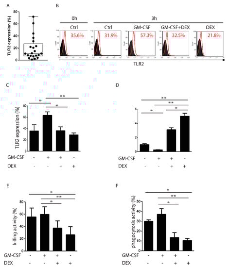 DEX downregulates TLR2 in human neutrophils. (A) Flow cytometry evaluation of TLR2 expression on human neutrophils (PMNs) isolated from buffy coats (n = 21). (B) In vitro treatment with the granulocyte-macrophage colony-stimulating factor (GM-CSF) upregulates TLR2 after 3 h (percentage of total cells), whereas DEX downregulates TLR2, either alone or in combination with GM-CSF. One representative staining is shown. (C) Summary and mean values of TLR2 expression as described in B. Values represent the mean ± SD of three independent experiments. (D) Quantitative RT-PCR of GILZ expression in PMNs under the same experimental conditions as described in (A). (E,F) Killing activity and phagocytosis, respectively, of PMNs treated in vitro with GM-CSF or DEX, either alone or in combination, or left untreated for 3 h. Values represent the mean ± SD of three independent experiments. * p < 0.05; ** p < 0.01.