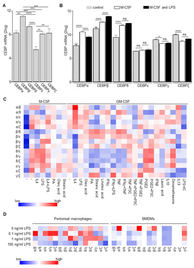CEBP family member expression in monocytes and macrophages. (A) C/EBPα, C/EBPβ, C/EBPδ, C/EBP, C/EBPγ and C/EBPζ mRNA expression in freshly isolated human monocytes derived from GSE5099 and GSE46903. Mean ± SEM (n = 3); **: p < 0.01; ***: p < 0.001; ****: p < 0.0001. (B) C/EBPα, C/EBPβ, C/EBPδ, C/EBPε, C/EBPγ and C/EBPζ mRNA expression in naïve, M-CSF and M-CSF/LPS treated monocytes from GSE46903. Mean ± SEM (n = 3–5). *: p < 0.05; ****: p < 0.0001; ns: non-significant. (C) Heatmap of the expression ratio of C/EBP family members in monocytes differentiated and activated with different stimuli (data derived from GSE46903). (D) Heatmap of the expression ratio of C/EBP family members in BMDM and peritoneal macrophages stimulated with different LPS concentrations (n = 3–4). Note that C/EBPε levels were below the detection limit in the BMDM samples.