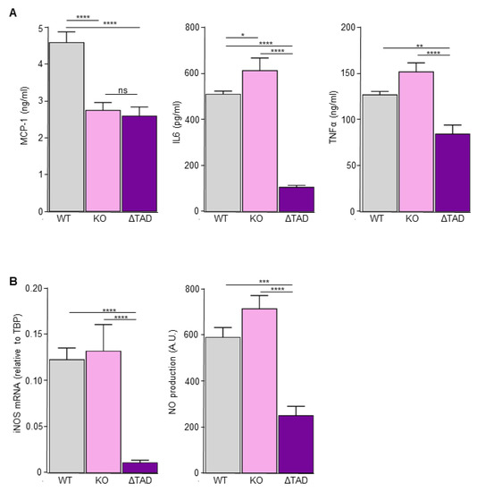 LPS-induced inflammatory and antibacterial response in wild-type (WT), C/EBPδ knock-out (KO) and C/EBPδ TAD mutant (ΔTAD) macrophages. (A) MCP-1, IL-6 and TNFα levels determined by ELISA in the supernatant of RAW264.7 macrophages stimulated with 100 ng/mL LPS for 24 h. (B) iNOS mRNA expression (left panel) and NO production (right panel) by RAW264.7 macrophages stimulated with 100 ng/mL LPS for 24 h. Shown is the mean ± SEM of three independent experiments performed with two individual wild-type, ΔTAD and KO clones. *: p < 0.05; **: p < 0.01; ***: p < 0.001; ****: p < 0.0001.