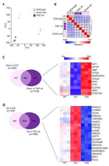 RNAseq gene expression analysis of wild-type (WT), C/EBPδ knock-out (KO) and C/EBPδ mutant (ΔTAD) macrophages. (A) Principal component analysis of pairwise genetic distances between the different macrophage subtypes. (B) Correlation heat map showing the Euclidean distances between the different macrophage subtypes. (C) Venn diagram showing overlap in downregulation of genes in knock-out and ΔTAD macrophages with a heatmap of genes downregulated in knock-out macrophages but upregulated in ΔTAD macrophages. (D) Venn diagram showing overlap in upregulation of genes in knock-out and ΔTAD macrophages with a heatmap of genes upregulated in knock-out macrophages but downregulated in ΔTAD macrophages. Heatmaps were generated using heatmapper (http://www.heatmapper.ca [39] assessed on 24 November 2020).