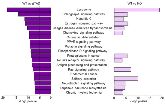 Functional enrichment analysis of differentially expressed genes. Significance (p-values) for KEGG pathways enriched in differentially expressed genes between wild-type and ΔTAD macrophages in wild-type vs. ΔTAD (left) and wild-type vs. knock-out (right) macrophages. The dotted lines indicate p = 0.05.
