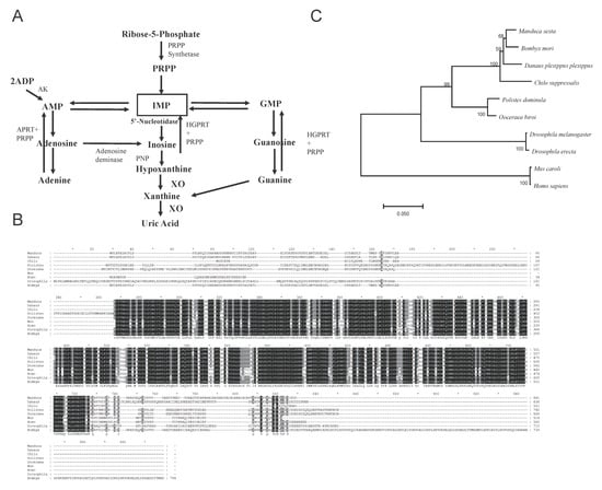 To identify the UA metabolism genes in the silkworm, we compared the sequences of genes in the human UA metabolism pathway with the published silkworm genome [43]. We cloned silkworm homologs by designing primers to amplify their coding sequences (Figure 1A and Table S2). By analyzing the amino acid sequences of putative purine metabolism genes, we identified the Bm5′N alignment of the 5′N amino acid sequences of human, mouse, and insect species (Figure 1B,C) indicated that 5′N is highly conserved, suggesting that it has retained a similar function in purine metabolism during evolution. QRT-PCR analysis showed that Bm5′N was expressed in various tissues and that it was expressed at high levels in malpighian tubules and fat body (Figure 2C).