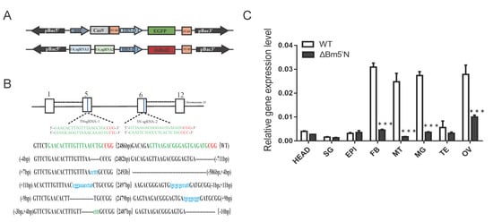 To investigate the function of Bm5′N in vivo, we obtained Bm5′N mutants using the CRISPR/Cas9 approach as previously described [44]. Through germline transformation, we generated two independent transposon-mediated transgenic lines (Figure 2A). We screened these two lines with an EGFP fluorescent marker for the Cas9-expressing line and a DsRed2 fluorescent marker for the sgRNA-expressing line. After crossing these two lines, offspring exhibiting fluorescence markers for both Cas9 and sgRNA expressions were detected. PCR sequencing demonstrated that these individuals carried large deletions of the Bm5′N gene (Figure 2B).