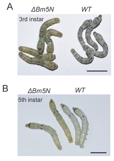 Bm5′N mutation results in the transparency of the larval integument. (A) Photographs of WT and ΔBm5′N G2 larva at the third instar. (B) Photographs of WT and mutant G2 larva at the fifth instar. Bars = 1 cm.