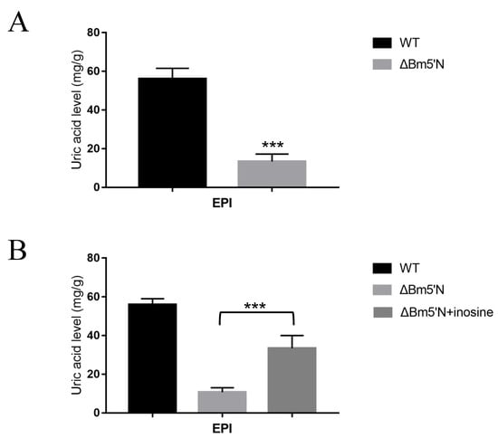 In humans, 5′N is involved in the synthesis of UA precursors (Figure 1A) [47]. We speculated that Bm5′N had a similar function in the silkworm. To investigate whether Bm5′N participates in UA precursor synthesis, we performed feeding experiments with inosine supplementation using fifth-instar larvae. We collected the epidermis for UA testing. Supplementation caused a significant increase in UA content in the epidermis of mutants (Figure 4B). These results indicate that the Bm5′N gene is involved in the synthesis of UA precursor substances, which means that the Bm5′N function is conserved between humans and silkworm.