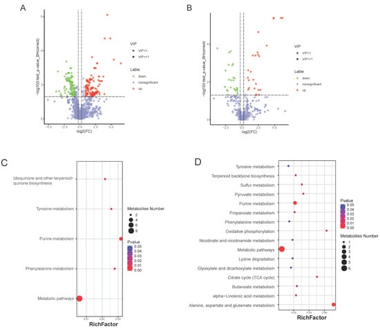 Metabolite production is disrupted in Bm5′N mutant. (A,B) Volcano plot of metabolites differentially expressed in malpighian tubules of WT and ΔBm5′N in (A) positive ion mode and (B) negative ion mode. Green, down-regulated metabolites; red, up-regulated metabolites; purple, no significant difference in metabolites. Differentially produced metabolites were identified by the following criteria: p-value < 0.05; Variable Important for the Projection ≥ 1; Fold-Change ≥ 1.2 or Fold-Change ≤ 0.83. (C,D) Enrichment factors representing the differential proportion of a metabolite relative to all metabolites in this pathway for differentially produced metabolites detected in (C) positive ion mode and (D) negative ion mode. The dot size indicates the numbers of metabolites.