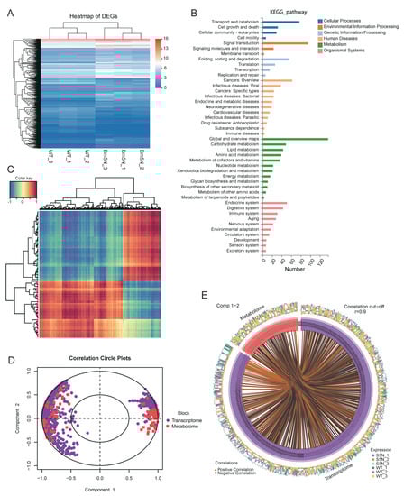 To identify genes that are differentially expressed in Bm5′N mutant and WT, we performed transcriptomic analyses of malpighian tubule tissue of the Bm5′N mutant and WT. Transcriptome data identified 3763 candidate genes. Additionally, a total of 972 differentially expressed genes were detected. We conducted pathway enrichment analysis and cluster analysis of differentially expressed genes (DEGs) bases on the KEGG database (Figure 6A,B). A large number of DEGs were involved in metabolic pathways. Interestingly, lots of human disease-associated pathways were related to these DEGs. To verify the consistency of results between metabolomics and transcriptomics data, we analyzed the correlation between DEGs and differentially produced metabolites through cluster analysis and mixOmics analysis. The RCCA results were visualized by the function of plotVar and circosPlot (Figure 6D,E). Overall, robust associations between several DEGs and differential metabolites were presented by using different methods, which further confirmed robust correlations between DEGs and differential metabolites. (Figure 6C–E). Our results suggest that the mutation of the Bm5′N gene resulted in the changes of metabolites and genes in the silkworm. This provides support for upstream gene research.
