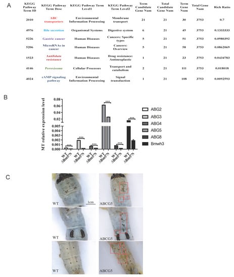 Transporter expression is disrupted in ΔBm5′N larvae. (A) Transporter genes differentially expressed in ΔBm5′N and WT larvae. (B) qRT-PCR analysis of ABC related gene’s mRNA expression in ΔBm5′N and WT at the fifth larval instar MT. (C) Enlargement of the translucent mosaic larval of ΔBmABCG5 at the fifth instar. The red box indicated representative areas of the translucent integument. *** p < 0.001.