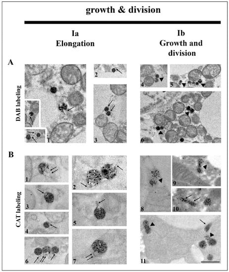 Canonic pathway of peroxisomal biogenesis through growth and division in brown adipocytes. Representative electron micrographs from both euthyroid and hypothyroid groups with DAB-labelled (A) and CAT-labelled (B) peroxisomes. This multistep pathway of biogenesis starts with the formation of membrane protrusions at spherical peroxisomes—the peroxisomal noses (A1–3,B3,4—arrows). Further elongation of noses (B1,2,5,6,7—arrows) leads to the formation of tubular structures (B10,11—arrows), which is supported by the import of new peroxisomal membrane proteins and lipids. The following step is the peroxisomal membrane constriction (segmentation of the membrane compartment) and forming dumbbell-like structures (A4,5,6, and B8,9,11—arrowheads), which leads to final division. Original magnification 17,000× and 22,000× (B2,5,7). Scale bar 1 μm.