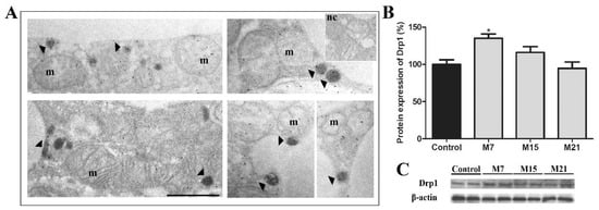 Immunogold labelling of Drp1 on representative images from the hypothyroid group treated with methimazole for 7 days (M7) (A) showing that the immunopositive reaction was localized on the mitochondrial outer membrane, on mitochondrial cristae, and some peroxisomes (arrowheads). m, mitochondria; dark peroxisomes labelled by DAB. Inset nc, negative control of immunolabeling. Original magnification 17,000×, scale bar 1 µm. (B) Protein expression of Drp1 in rat brown adipose tissue of the euthyroid control (black) and hypothyroid groups (grey) treated with methimazole for 7 (M7), 15 (M15), and 21 (M21) days, respectively. The protein content is expressed as a percentage of the control. Band images from a representative blot of three trials are shown (C). Bars represent the mean ± SEM. * Compared to control, * p < 0.05.