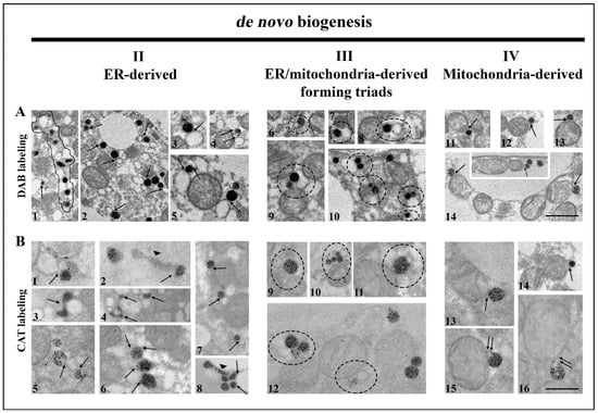 Ways of de novo peroxisomal biogenesis in brown adipocytes. Representative images from both euthyroid and hypothyroid groups with DAB-labelled (A) and CAT-labelled (B) peroxisomes. ER-derived peroxisomes (A1–5,B1–8) are still connected with ER cisterns (arrows), by membranous bridges that connect these two organelles (A2–5, and B1,5—arrows). Note the long pre-peroxisomal cisterns of ER (B2,8—arrowhead), but also structure-like “pearls on a string” (A1—outlined structure). ER/mitochondria-derived peroxisomes are also connected to ER and mitochondria at the same time, making triads of organelles (A6–10,B9–12—circles). Triads in brown adipocytes suggest a hybrid nature of newly born peroxisomes. Mitochondria-derived peroxisomes (A11–14,B13–16) are also connected to mitochondria via membranous bridges (arrows), suggesting that peroxisomes could originate from mitochondria in brown adipocytes. Original magnification 17,000× (A), and 22,000× (B). Scale bars 1 μm.