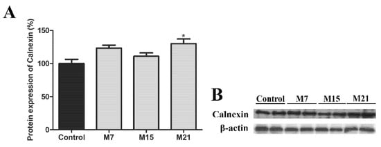 Protein expression of ER marker calnexin in rat brown adipose tissue of the euthyroid control (black) and hypothyroid groups (grey) treated with methimazole for 7 (M7), 15 (M15), and 21 (M21) days, respectively (A). The protein content is expressed as a percentage of the control. Band images from a representative blot of three trials are shown (B). Bars represent the mean ± SEM. * Compared to control, * p < 0.05.