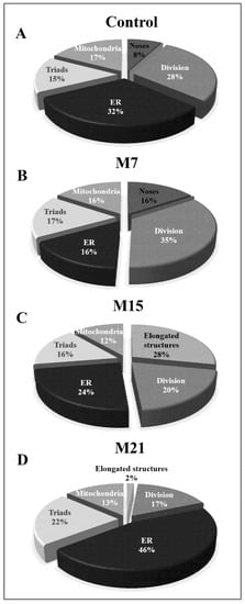 Extent of peroxisomal biogenesis pathways in brown adipocytes (forty cells per group) from euthyroid control (A) and hypothyroid groups treated with methimazole for 7 (M7) (B), 15 (M15) (C), and 21 (M21) (D) days, respectively. The relative number of peroxisomal noses (Noses), peroxisomal division present through dumbbell-like structures (Division), peroxisomal tubules (Elongated structures), peroxisomal biogenesis by budding from sER (ER), hybrid nature of peroxisomal origin (Triads), and peroxisomal biogenesis by budding from the mitochondrial outer membrane (Mitochondria) are represented as percentages.