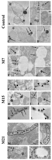 Maturation level of newly born peroxisomes in rat brown adipocytes in euthyroid control (A–D) and hypothyroid groups treated with methimazole for 7 (M7; E,e1,e2), 15 (M15; F–L), and 21 (M21; M–P) days, respectively. The strongest immunopositivity for CAT was found in globular, single, fully mature peroxisomes (A,C,J,e1,e2—arrows), but also in peroxisomes, which had started the division process and has a nose (D,H—arrows). CAT immunopositivity in peroxisomes that originated from the sER (B,I,K,O,P—arrows) was weaker. Even lower CAT immunopositivity was noticed in peroxisomes within “pearls on strings” which originate from the pre-peroxisomal tubules on day 21 (M,N—outlined structure). The weakest CAT immunopositivity occurred in peroxisomes close to the lipid bodies on day 7 (E—arrows); some peroxisomes within “pearls on strings” (F—arrowhead); and in very elongated peroxisomes, which originated from the pre-peroxisomal sER, which were CAT negative in their final narrower part (G,L—arrowhead). Inset nc, negative control of immunolabeling. Magnification 17,000×.