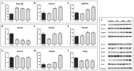 Protein expression of peroxins and PMP70 in rat brown adipose tissue of the euthyroid control (black) and hypothyroid groups (grey) treated with methimazole for 7 (M7), 15 (M15), and 21 (M21) days, respectively. Pex11β (A), Pex19 (B), PMP70 (C), PEX16 (D), Pex5L (E), Pex5S (F), Pex13 (G), Pex26 (H), Pex6 (I). The protein content is expressed as a percentage of the control. Band images from a representative blot of three trials are shown (J). Bars represent the mean ± SEM. * Compared to control, * p < 0.05, ** p < 0.01, *** p < 0.001.