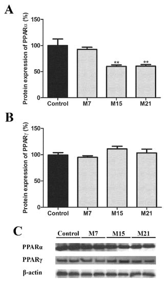 Protein expression of PPARα (A) and PPARγ (B) in rat brown adipose tissue of the euthyroid control (black) and hypothyroid groups (grey) treated with methimazole for 7 (M7), 15 (M15), and 21 (M21) days, respectively. The protein content is expressed as a percentage of the control. Band images from a representative blot of three trials are shown (C). Bars represent the mean ± SEM. * Compared to control, ** p < 0.01.