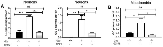 Glucosylceramide (GC) and glucosylsphingosine (GS) analysis by LC/MS-MS in neurons and isolated mitochondria. (A) GC and GS levels in Gba-/- neurons were significantly reduced by 300 nM GZ452 treatment. (B) In the isolated mitochondria, GC level in GZ452-treated Gba-/- neurons was reduced to WT (Gba+/+) level. Triplicate experiments (n ≥ 2–4 samples). One-way ANOVA (* p < 0.05; ** p < 0.01; *** p < 0.001). ns, not statistically significant.